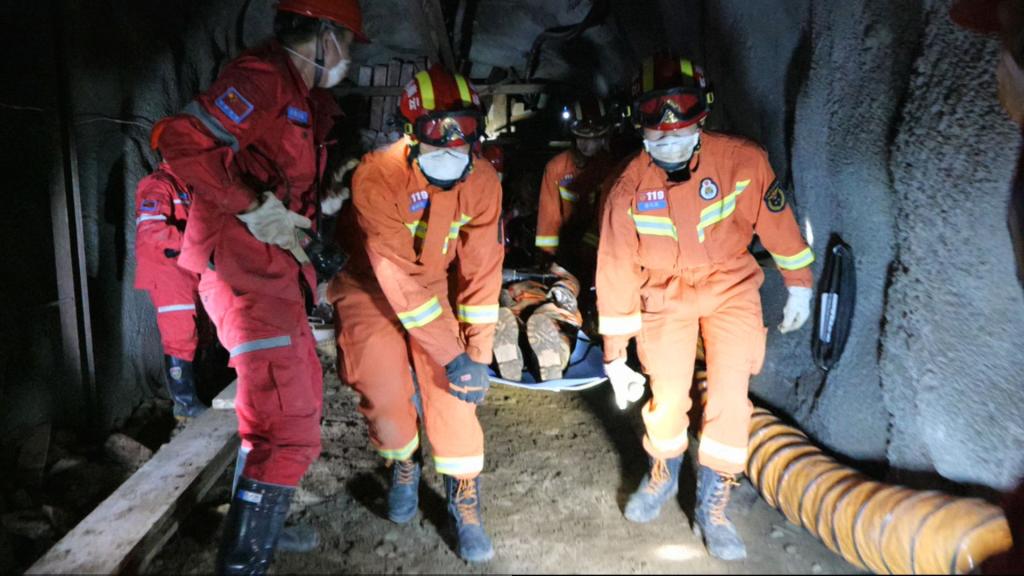 在制定科學(xué)救援方案后,救援隊員佩用正壓式氧氣呼吸器,攜帶雷達(dá)生命探測儀、熱成像儀、氣體檢測儀、對講機(jī)和個人防護(hù)裝備等進(jìn)入巷道冒頂區(qū)域進(jìn)行現(xiàn)場安全確認(rèn)和被困人員搜尋,經(jīng)雷達(dá)生命探測儀搜尋顯示3名被困人員有生命體征,但現(xiàn)場一氧化碳濃度78ppm超標(biāo),需對救援現(xiàn)場進(jìn)行機(jī)械通風(fēng),巷道冒頂嚴(yán)重,需進(jìn)行支護(hù)。在把現(xiàn)場搜尋情況及時層層匯報后,救援隊員攜帶風(fēng)機(jī)、風(fēng)帶、支護(hù)材料和破拆工具等設(shè)備分兩個組先后進(jìn)入事故現(xiàn)場,照明、通風(fēng)、巷道支護(hù)作業(yè)隨即鋪開。準(zhǔn)備工作就緒后,現(xiàn)場救援人員采用《礦山(隧道)事故救援聯(lián)絡(luò)信號》聯(lián)絡(luò)被困人員,救援隊員用細(xì)木棍將系有食品、水的導(dǎo)繩從管道送給受困人員,并安撫受困人員情緒。不料,在快速的支護(hù)推進(jìn)中,突然地壓活動頻繁,頂板再次冒落,救援隊在同受困人員保持聯(lián)系的同時,只得暫時退至安全區(qū)域待命。4名專家技術(shù)人員再次進(jìn)入事故現(xiàn)場勘察和評估,經(jīng)專家技術(shù)組確認(rèn)現(xiàn)場地壓穩(wěn)定,可以向前支護(hù),搶險救援組再次進(jìn)入現(xiàn)場進(jìn)行向前支護(hù)、清理巷道。鄒文鴻等領(lǐng)導(dǎo)在現(xiàn)場指揮著救援工作,要求救援人員要時刻留意事故現(xiàn)場環(huán)境,保證自身安全才能解救他人。經(jīng)救援人員的共同努力,生命通道成功打通,被救出的3名受困人員均無大礙,已在醫(yī)務(wù)人員的護(hù)送下離開事故現(xiàn)場,去往就近醫(yī)院接受系統(tǒng)的檢查和治療。經(jīng)救援隊現(xiàn)場搜尋確認(rèn)已無受困人員,鄒文鴻下令各工作組撤離事故現(xiàn)場。