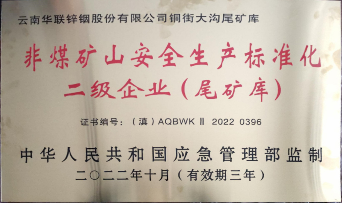 近日,華聯鋅銦公司銅街大溝尾礦庫、新田尾礦庫順利獲得“非煤礦山安全生產標準化二級企業”認定,并收到由中華人民共和國應急管理局監制、云南省應急管理廳頒發的牌匾和證書。