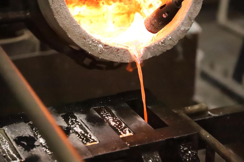 走進電解槽面作業區,456個電解槽猶如被耙犁過的土地,整齊有序地排列在眼前,湛藍的電解液將銅陽極板浸泡包裹住,在電解職工的精耕細作下,經過一系列化學反應、游離、附著、沉降…從電解藍中長成橙紅色的銅,同時,金、銀、鉑、鈀等多種貴金屬降藏在銅陽極泥中,將前往貴金屬開啟下一段奇妙之旅,最終形成金錠、銀錠等產品。這里生產出的每一噸銅、每一斤銀、每一克金都沾染著電解全體黨員干部職工辛勤的汗水,凝聚著大家的心血和智慧。“金耕細作·銀起銅興”是對電解最貼切的描述,也是電解所有人的心之所愿,心之所向!